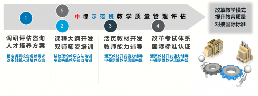 本项目以中德示范班的形式,借鉴德国联邦职业教育研究所(BIBB)确定的最新“培训职业”目录,结合我国职业教育专业大类和专业群设置,通过“教育过程分析/课程开发”、“教师资格认证/辅导开发”、“校企合作/企业师资培训”、“教学和学习材料开发”、“以行动为导向的测试/考官资格”、“项目管理/质量管理”六大实施流程,系统性的实现“人才培养模式改革探索”、“人才培养方案开发建设”、“教师教学能力素质提升”、“创新教学学习材料开发”、“国际标准考试测评体系”、“中德示范班建设和教学质量评估”的六大目标,最终实现组织化的学校、行业、企业和社会的互动,从而帮助各级职业院校完善组织体系的有效治理。